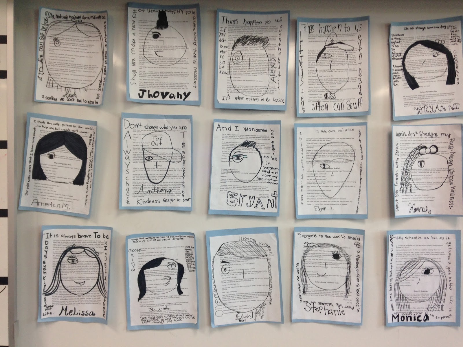 We read Wonder all year, and thanks to our DonorsChoose project being funded mid-year, we got a class set of books that had the Julian Chapter in it. This book changed our classroom culture in a big way! I printed out pages from the book and they drew their own Wonder portraits on top of the words and pulled their favorite quotes and wrote them on the sides.