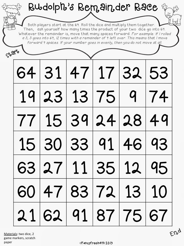 Rudolph’s Remainder Race has 2 versions. Once is simple division with remainders, and the other asks for the students to do a two-step equation (multiply first and then divide). I did an activity similar to this in a CCSS math workshop and the teachers that were their did not want to stop playing! We joked about bringing it into the teacher’s lounge at lunch to play.